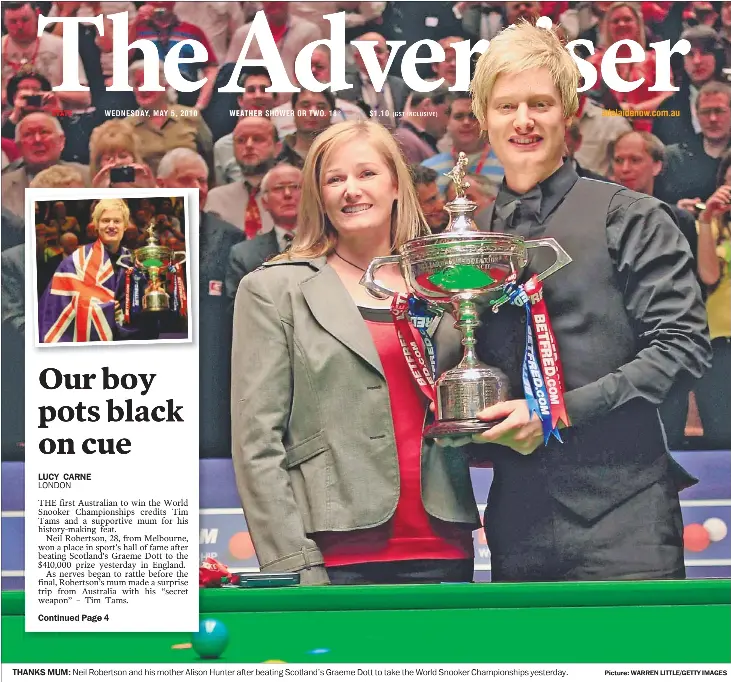 At the age of 17 he reached the third qualifying round of the 1999 World Championship. Proud mum Alison Hunter was there to see the win and ran from the stands wrapped in an Australian flag to hug her son who then draped himself in. Melbourne snooker star Neil Robertson poses with his mother Alison Hunter after winning the world title in Sheffield England.