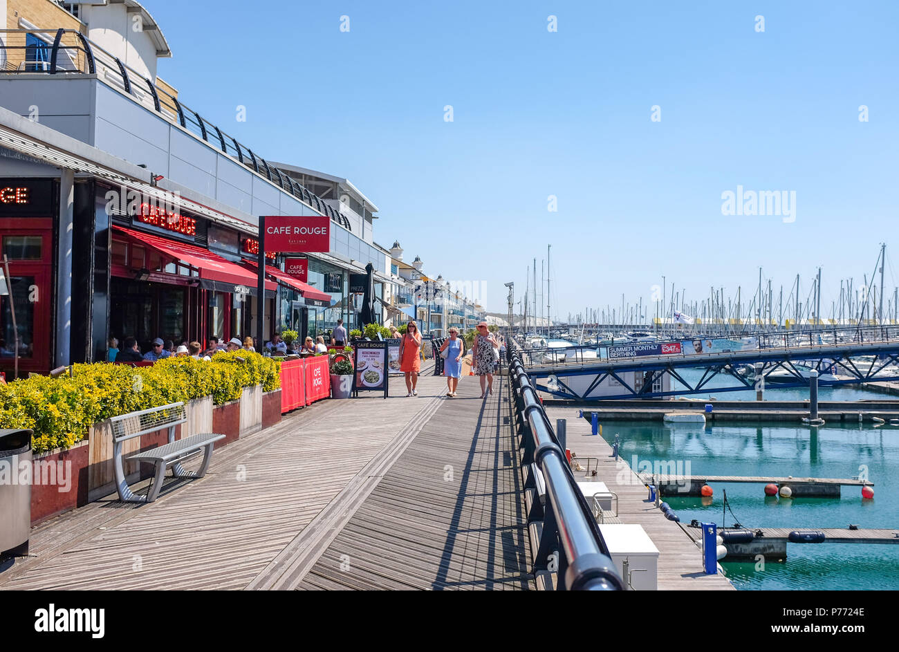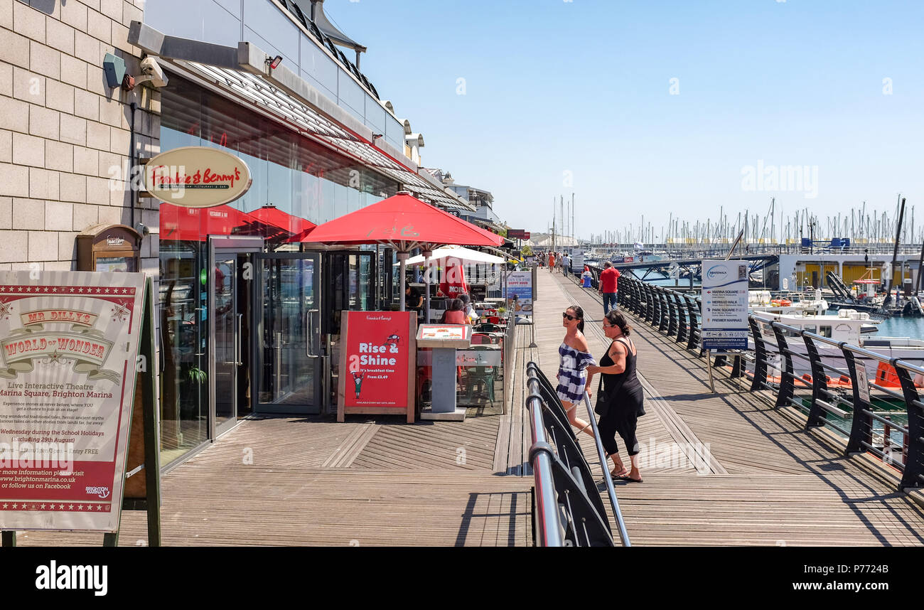 Brighton Marina Village Boardwalk Bars Cafes Restaurants Including Frankie Bennys With People In Summer Stock Photo Alamy